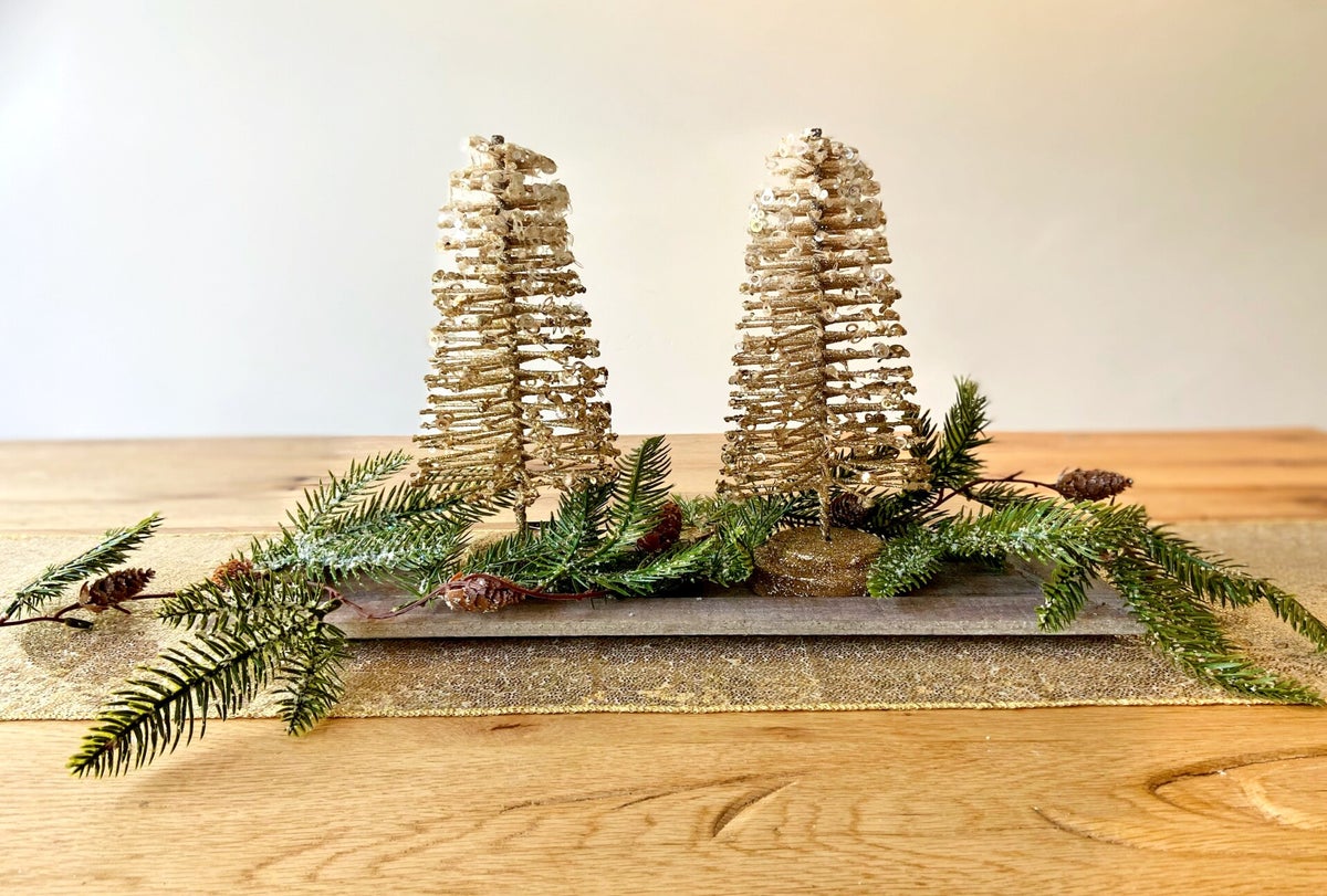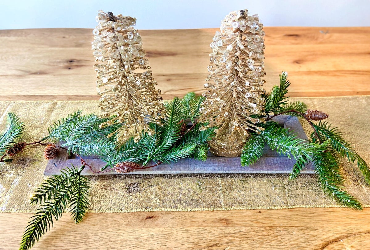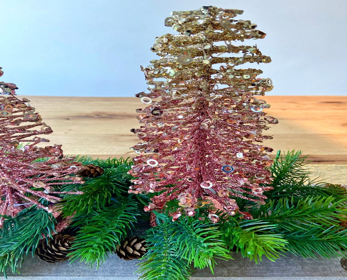 Twee schitterende donker bronzen gouden kerstbomen, van verschillende hoogtes, stralen feestelijke elegantie uit met sprankelende glitters en sierlijke kerstslinger met dennenappels. De warme houten schaal voegt een vleugje natuurlijke charme toe aan deze feestelijke creatie. Een onweerstaanbare toevoeging aan je kerstdecor en het perfecte geschenk voor geliefden.