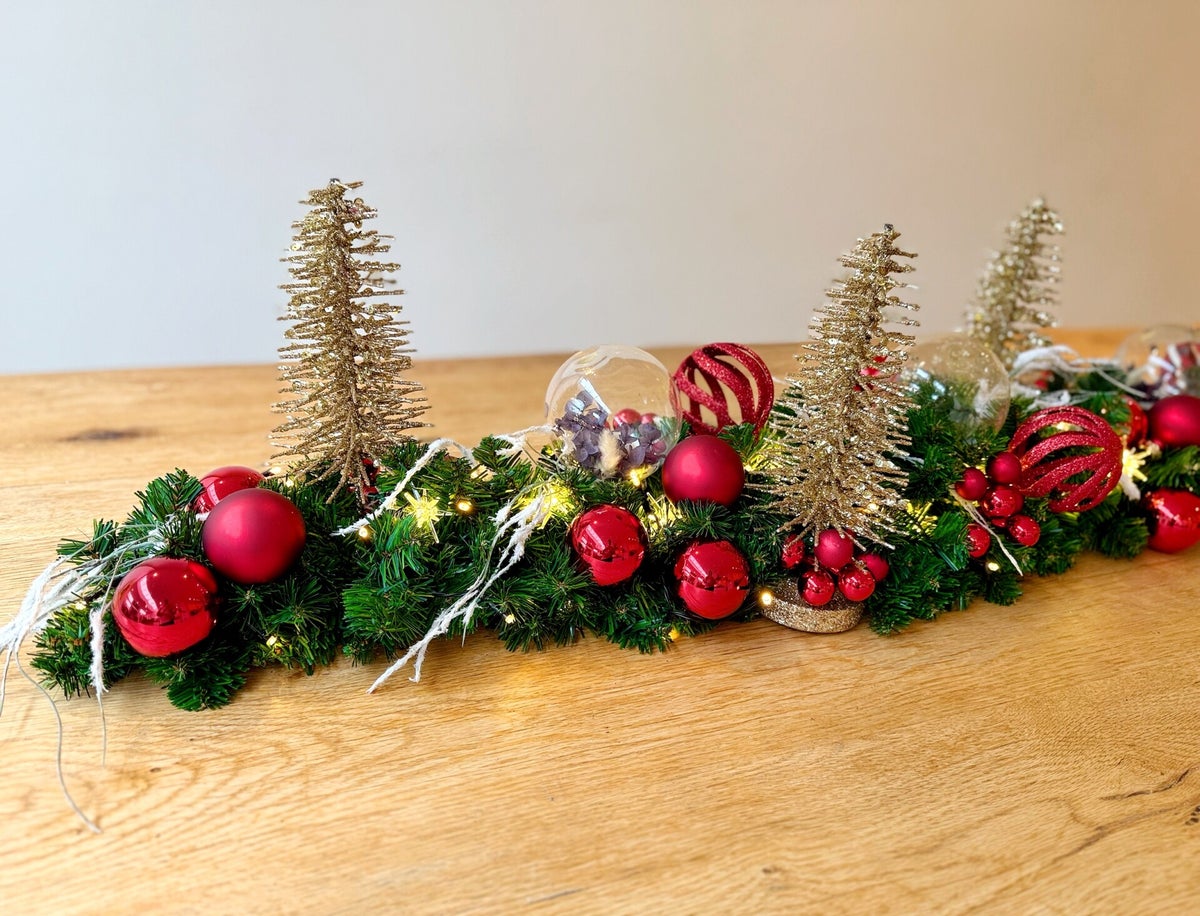 Transformeer je kerstdecor met onze zelf samengestelde kerstslinger," een volle, luxe slinger versierd met schitterende rode kerstballen en sprankelende gouden glitterkerstbomen. Deze exclusieve decoratie creëert een betoverende sfeer en is perfect voor op de tafel, vensterbank, piano of kast. Breng de magie van de feestdagen in huis en maak je kerst onvergetelijk! Voeg een vleugje luxe toe aan elke ruimte en geniet van de warme ambiance die deze slinger biedt.