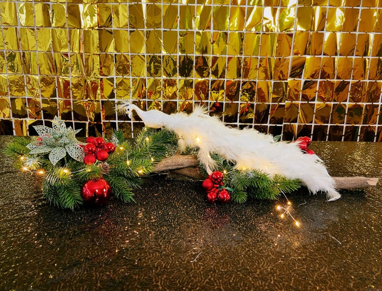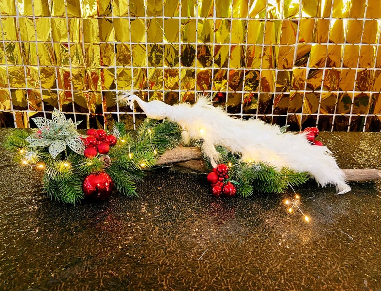 Dit is een fijn kerststuk met gouden takken en prachtige kleurige vogeltjes erop. De zwarte glitter bladeren zorgen voor een mooi contrast.