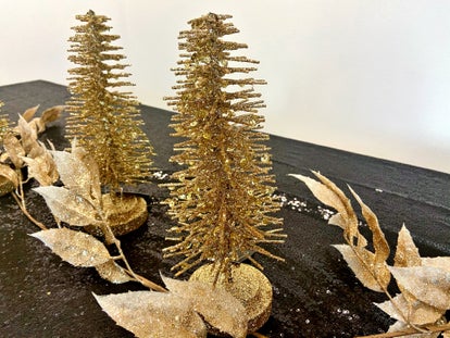 De bomen zien er beeldig uit. Ze hebben een fluwele stof met gouden glitters op de top.