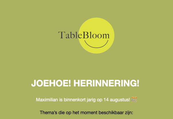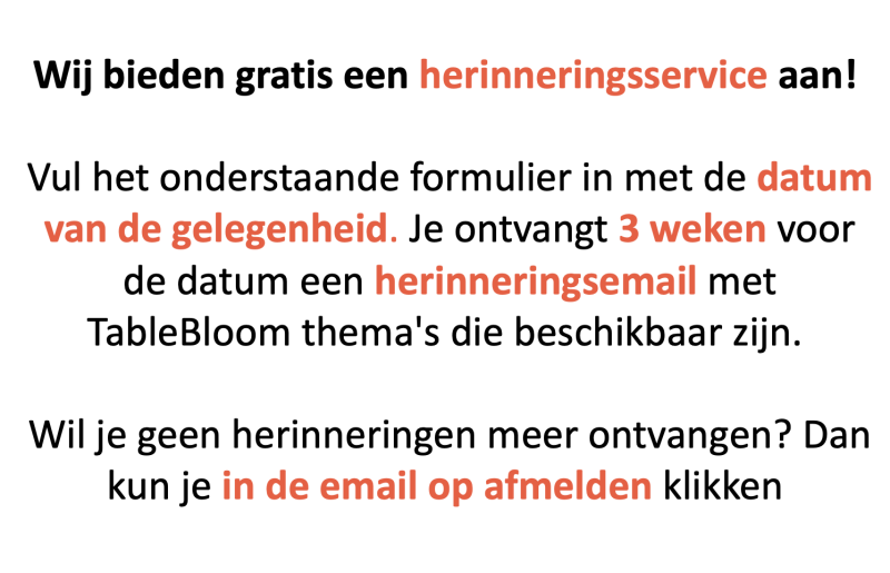 De gegevens worden niet met derden gedeeld die een ander doel hebben dan een herinneringsmail te versturen vanuit TableBloom.