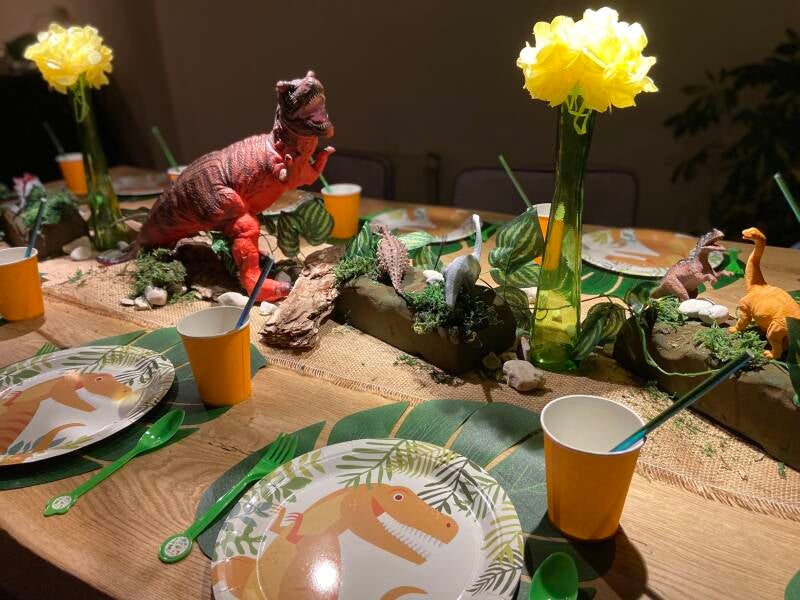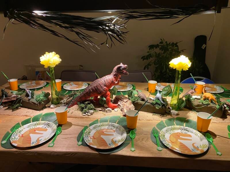 We hadden een leuke uitdaging! Een klant had boven de tafel een laaghangende lamp, waardoor de palmbladeren niet in de vaas pasten. Geen probleem! We hebben de palmbladeren aan de lamp bevestigd en de gele bloemen op de vaasjes geplakt. Zo hebben we er een vrolijke en creatieve oplossing van gemaakt! 🌿✨