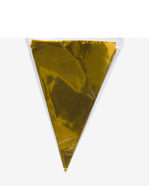 Aan deze 6 meter lange vlaggenlijn hangen feestelijke goudkleurige vlaggetjes van zo'n 30 cm hoog, gemaakt van flexibel plastic.