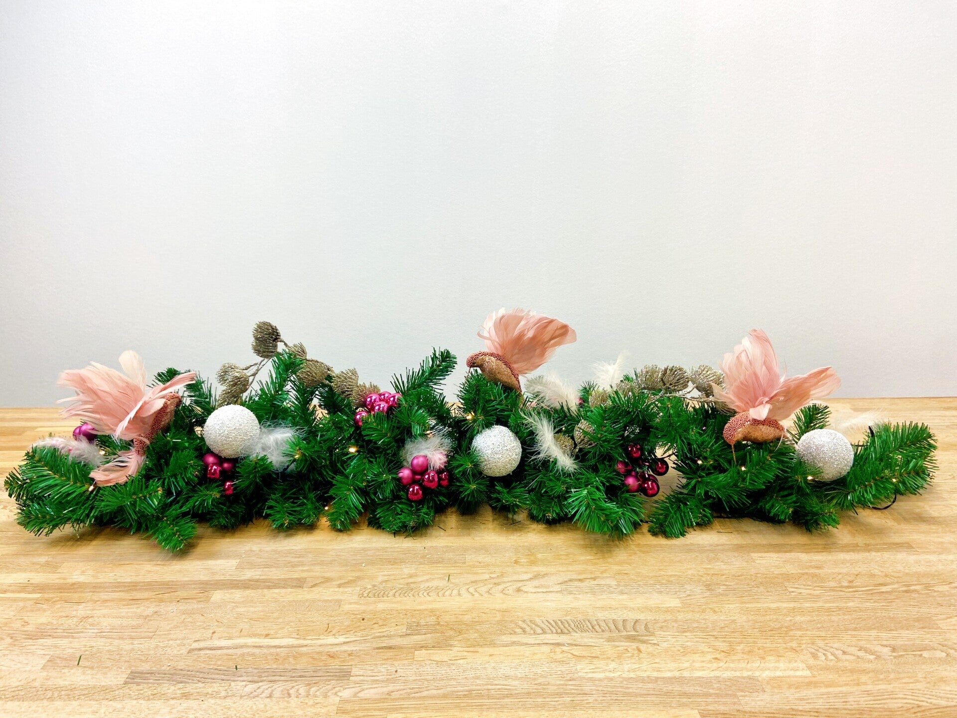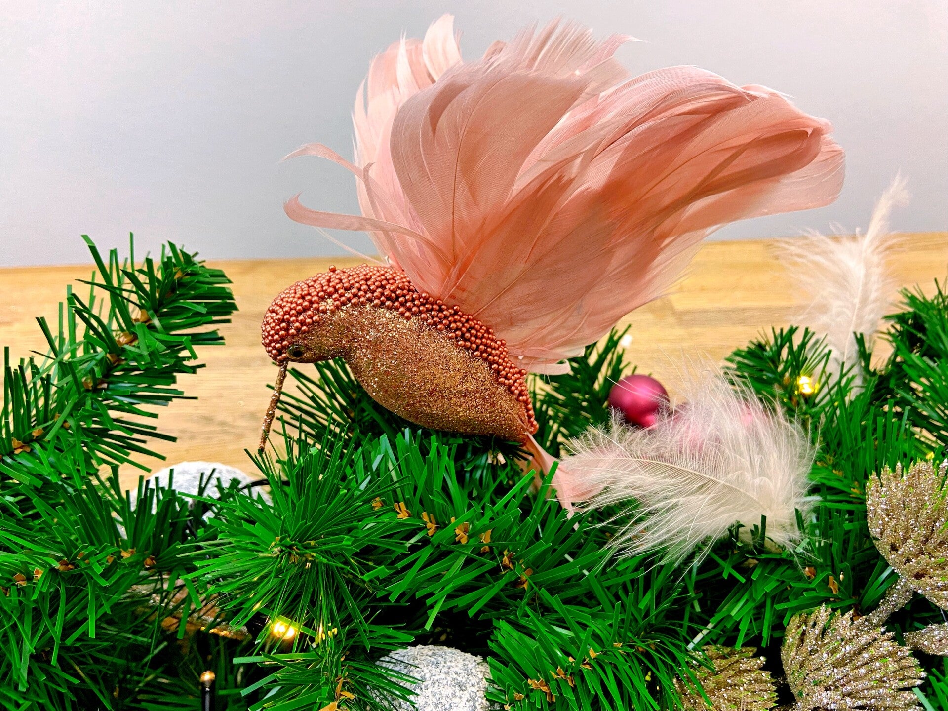 Creëer een sprookjesachtige kerstsfeer met onze prachtige kerstslinger, geaccentueerd door drie luxe roze kolibries. Elke kolibrie is rijkelijk versierd met adembenemende veren en fonkelende kraaltjes, waardoor deze slinger een elegant statement maakt. De weelderige toevoeging van kerstballen en extra veren maakt deze slinger een must-have voor een feestelijk en weelderig kerstinterieur.