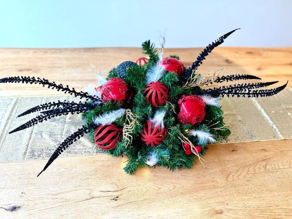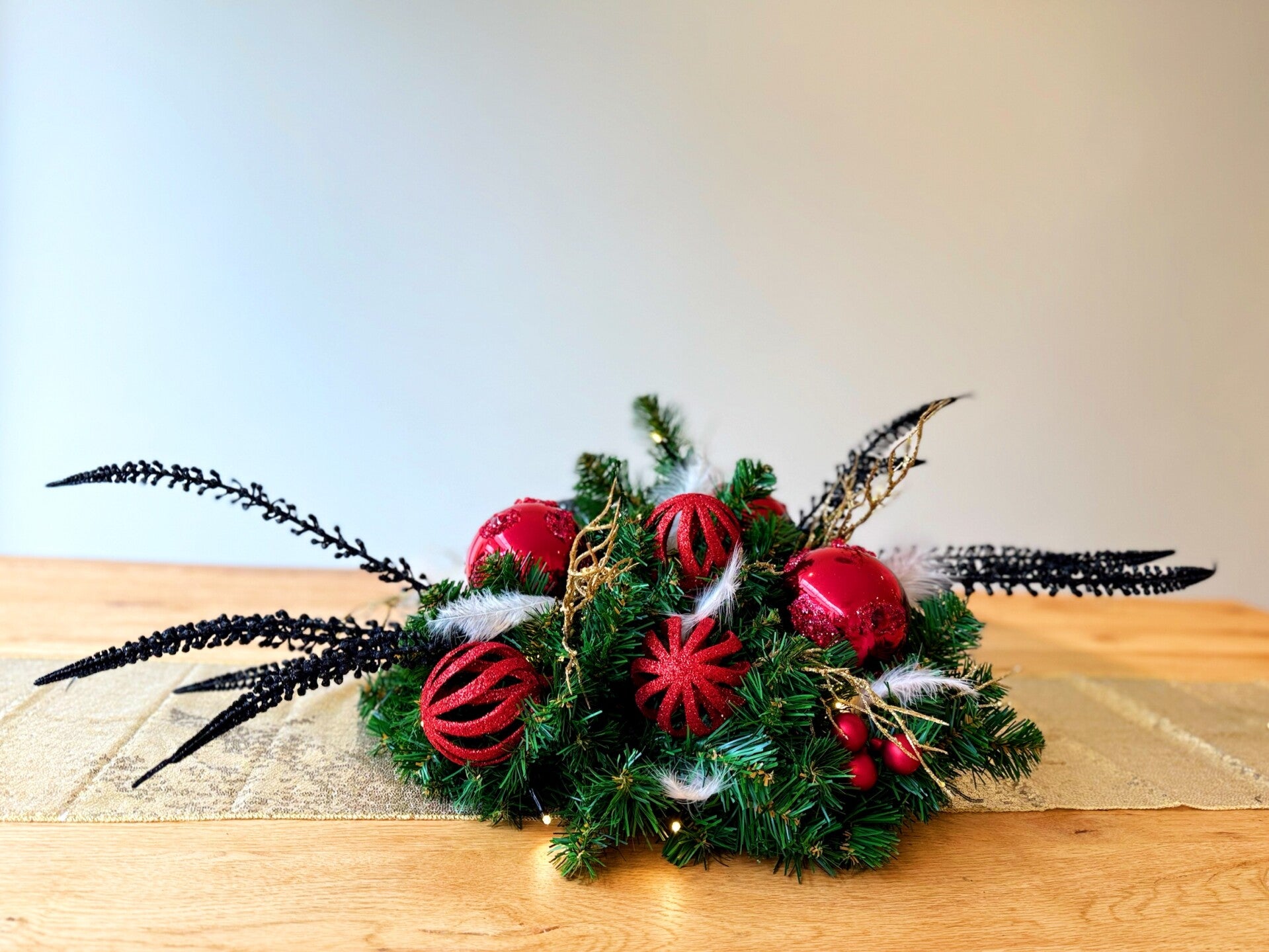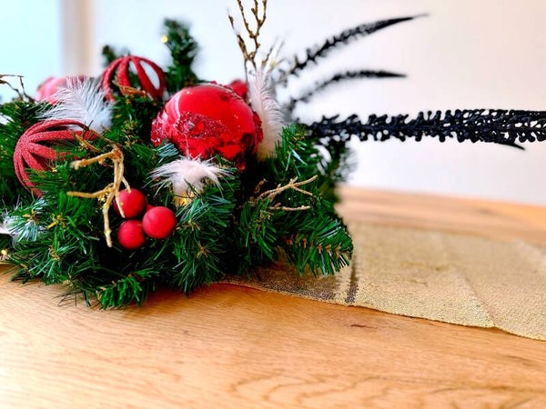 Verrijk je kerstdecor met onze luxe versierde kerstslinger, waar twee prachtig versierde vogels schitteren met glitters en veren, omringd door schitterende kerstballen en diverse glinsterende takken. Breng een vleugje weelderige elegantie in je feestelijke inrichting met deze betoverende kerstslinger.