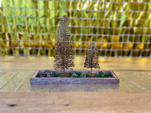 Deze betoverende blikvangers, één groot en één klein, stralen feestelijke schittering uit en brengen een sprankelende sfeer in elke ruimte. Geleverd in een stijlvolle houten schaal, verrijkt met natuurlijke dennenappels, zijn deze glitterbomen de perfecte toevoeging aan uw kerstdecor.