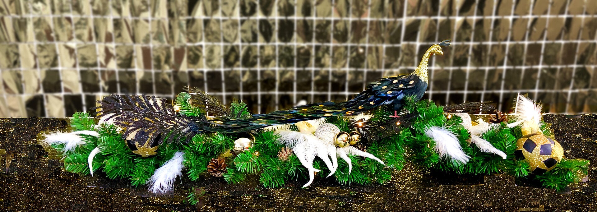 3. Plaats de pauw op het hoogste punt van de kerstslinger en bevestig het vast door een tak van de kerstslinger om de poten van de pauw te vouwen. Ben je niet tevreden met de hoogte van de pauw? Dan vouw je de slinger meer omhoog.