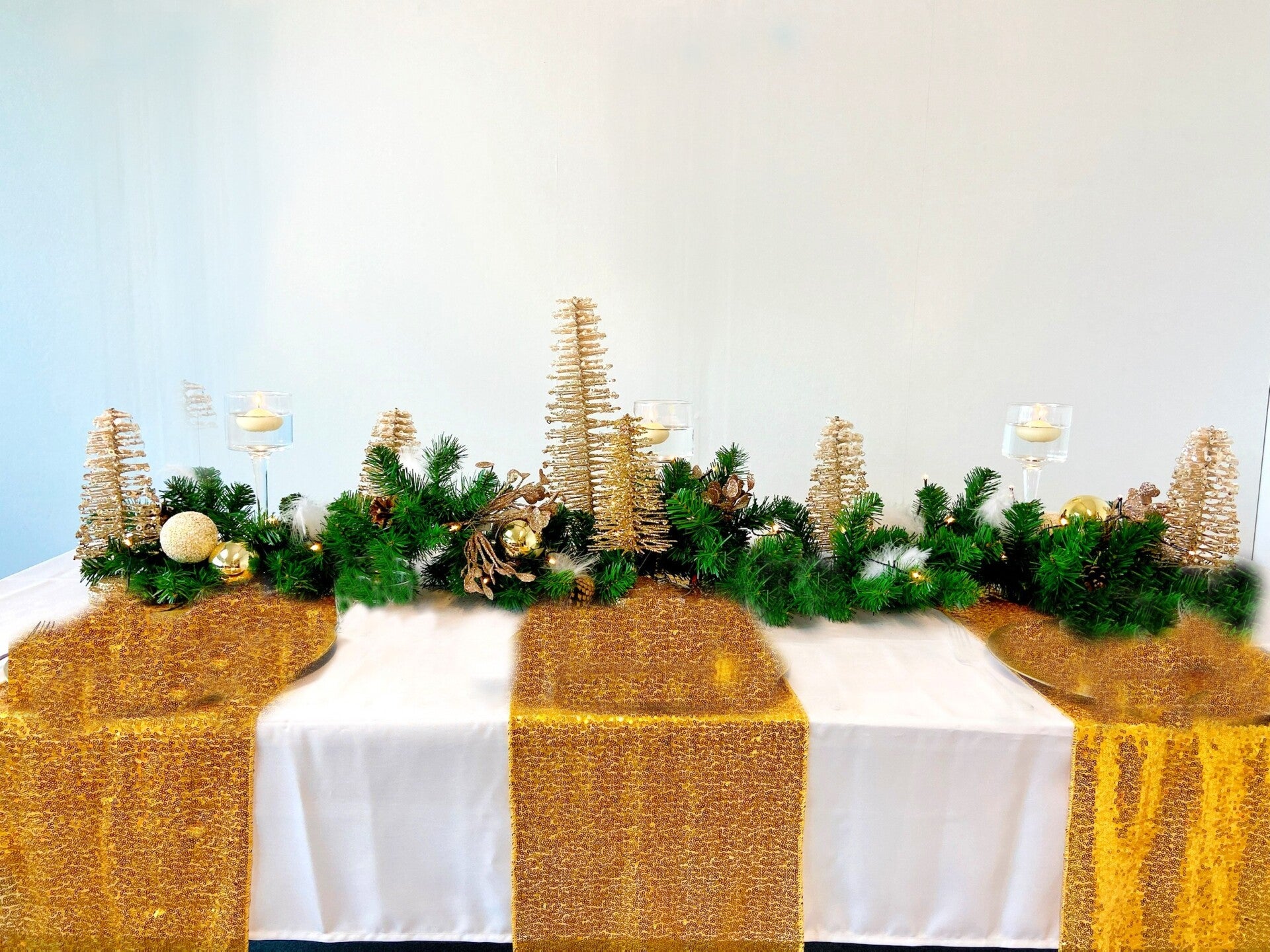 Wat een kerstsfeer geven de kerstbomen. Ze glinsteren mooi en de kaarshouders met water is romantisch.